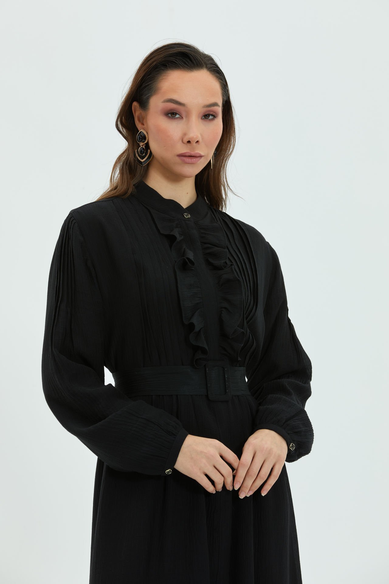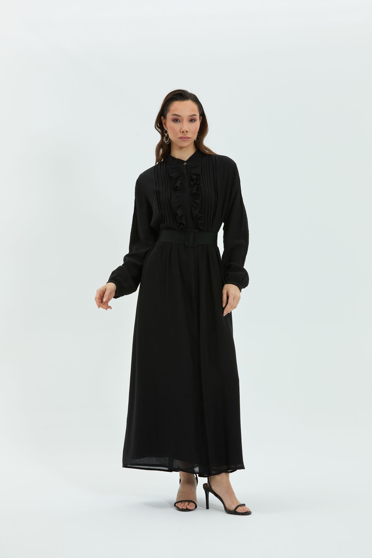 Siyah fırfırlı elbise, zarafeti ve şıklığı bir arada sunar. İnce detaylı fırfırları sayesinde hareketli ve feminen bir görünüm sağlar. Hem özel davetlerde hem de gündelik şıklıkta rahatlıkla tercih edilebilir. Vücuda tam oturan kesimi, konforu da garanti eder.