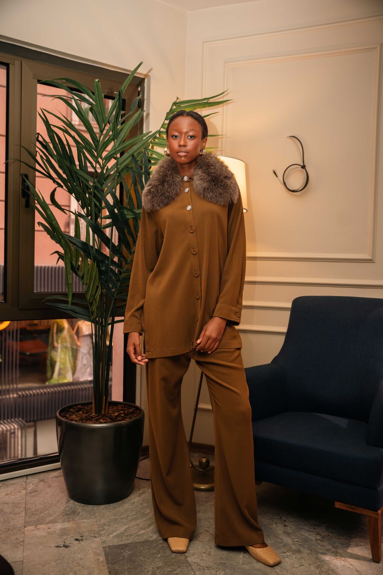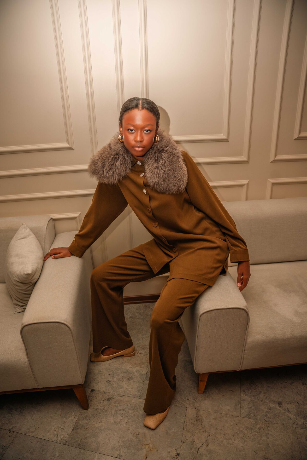 İnce detaylarla tasarlanmış tilki kürklü takım, zarafeti ve şıklığı bir arada sunar. Yumuşak kürk dokusu, takıma lüks bir hava katar. Hem günlük hem özel davetlerde rahatlık ve prestij sağlar. Modern kesimi ile tarzınızı kolayca yansıtabilirsiniz.