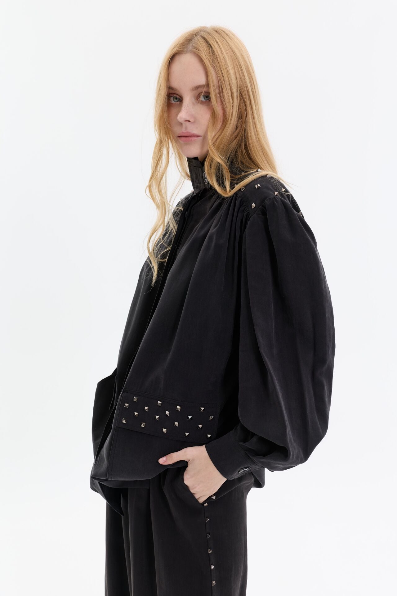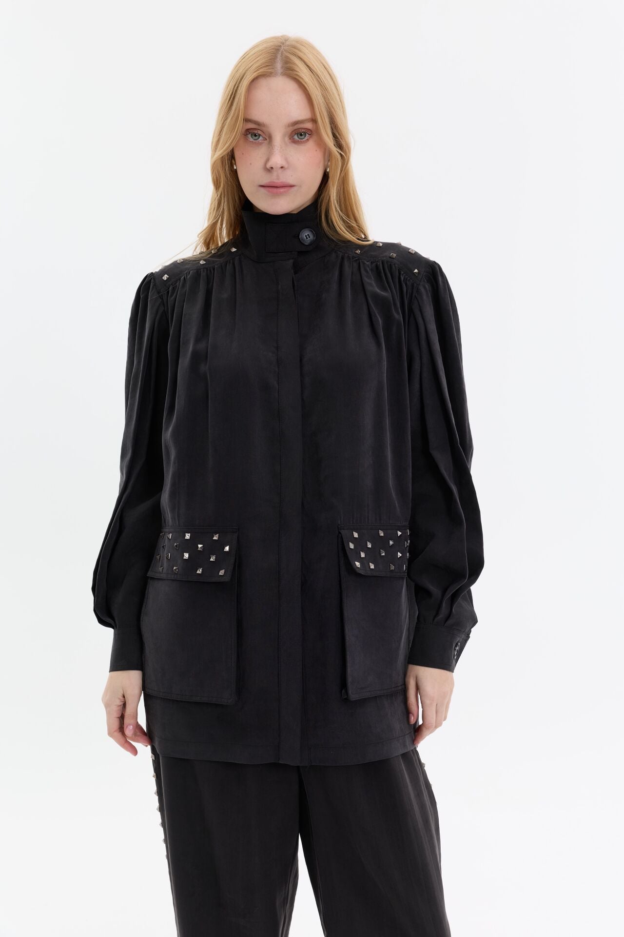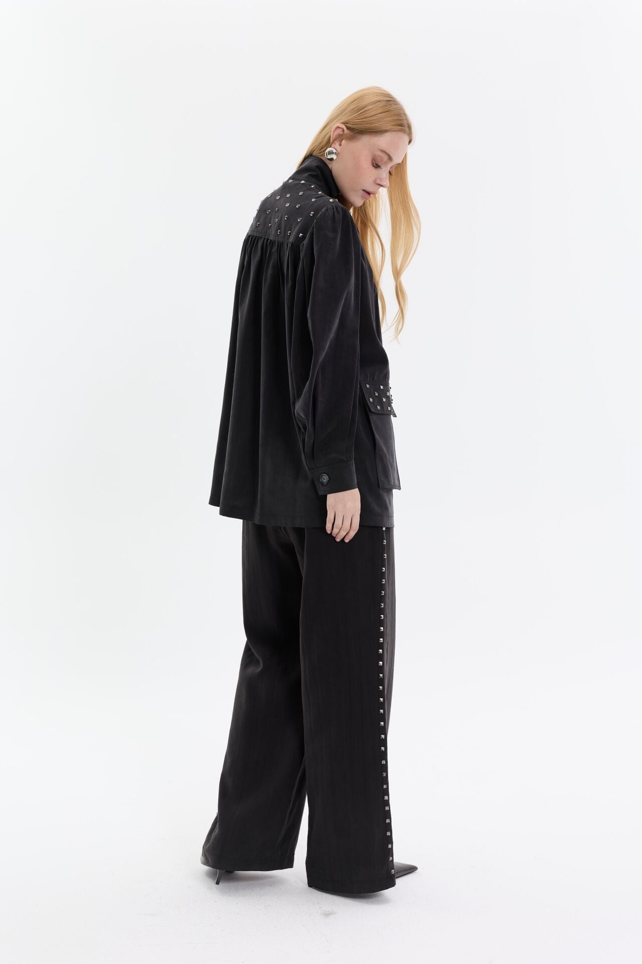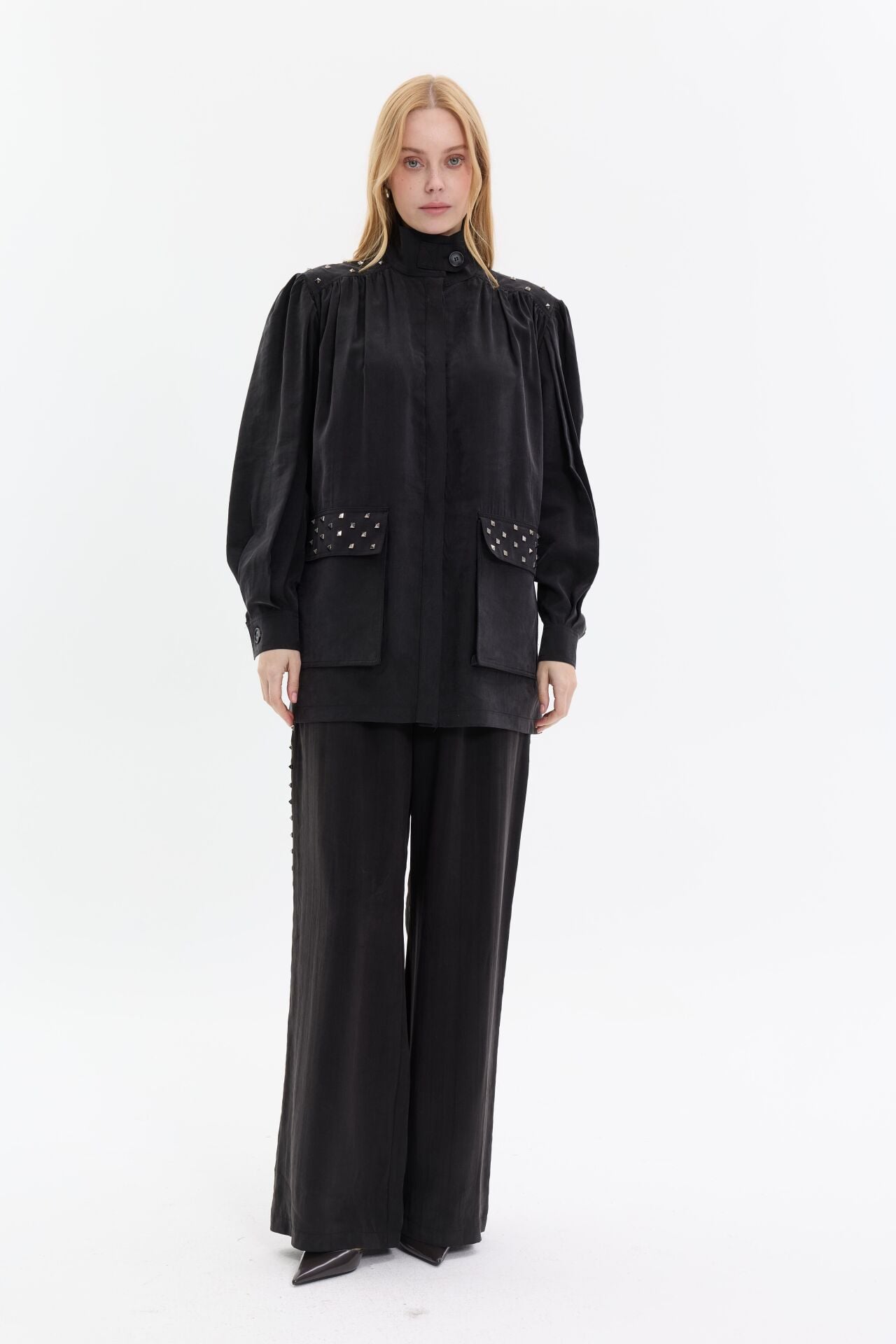Modern ve iddialı tasarımıyla öne çıkan ikili takım, gold zımba detaylarıyla güçlü bir stil vurgusu yapar. Yüksek yaka ve rahat kesim üst formu, geniş paça pantolonla dengelenerek hem konforlu hem etkileyici bir siluet oluşturur.