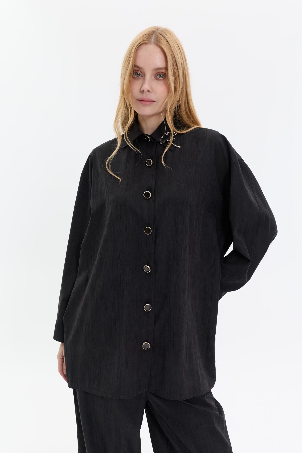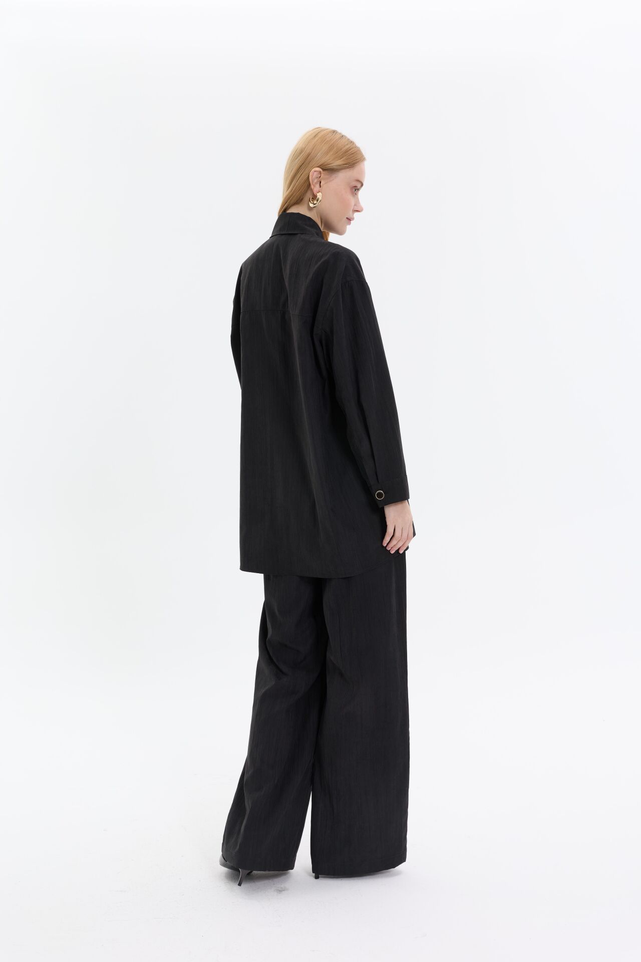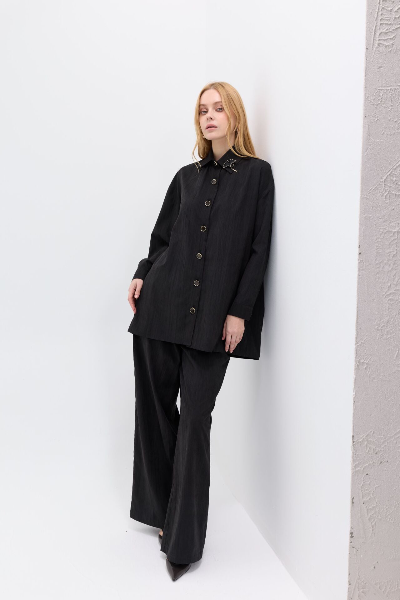Minimal tasarımı yaka aksesuar detayıyla tamamlanan ikili takım, zahmetsiz şıklığın en modern hali. Rahat kesim uzun üst ve akıcı pantolon formu sayesinde hem konforlu hem sofistike bir görünüm sunar.