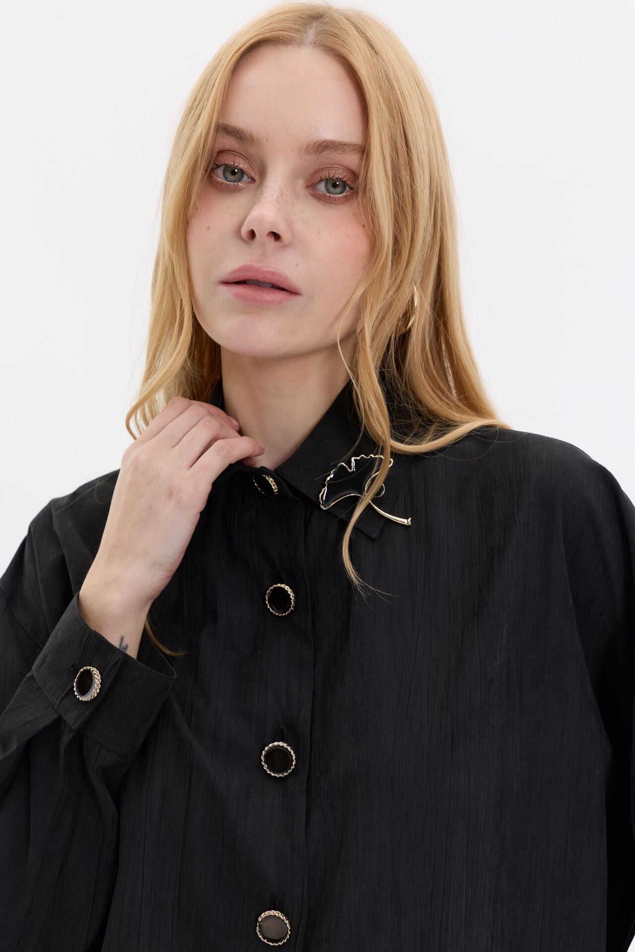 Yaka broş detaylı uzun üst