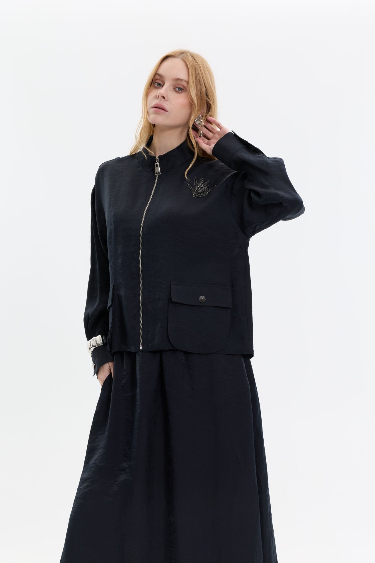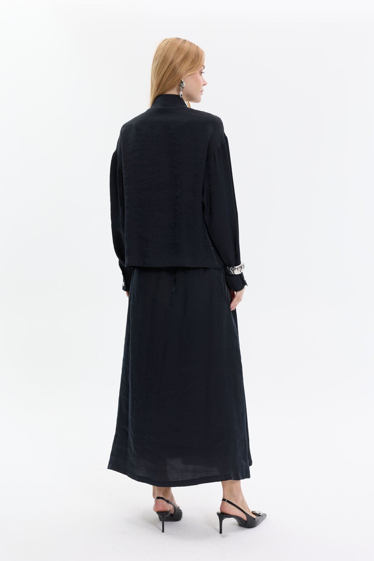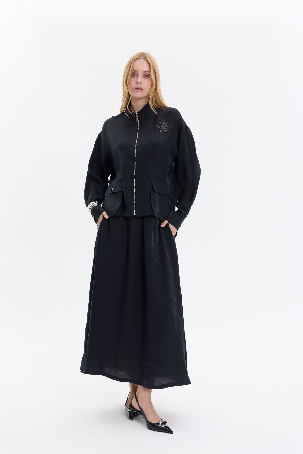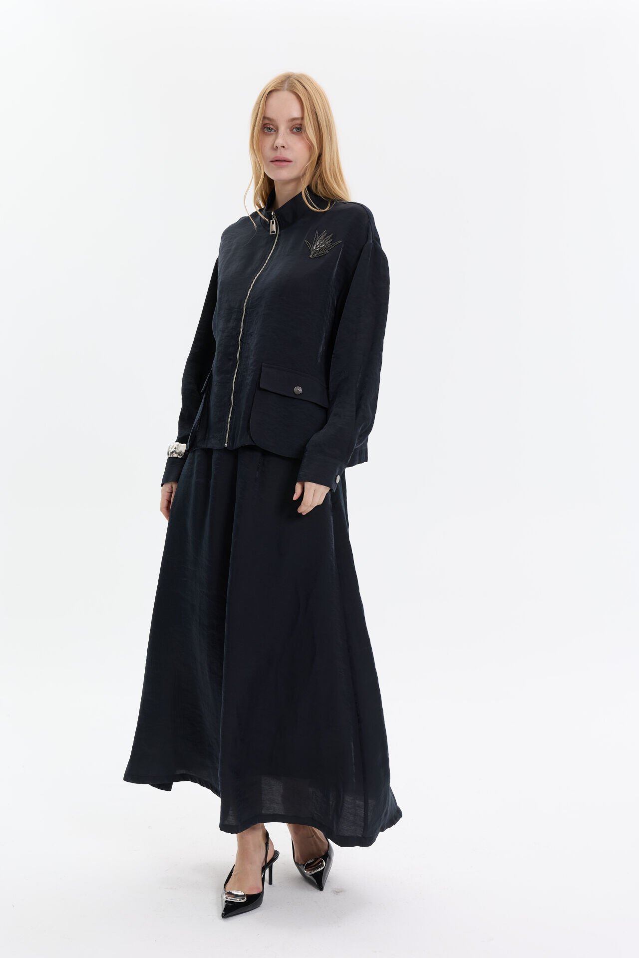 Modern çizgilerle tasarlanan bu etekli takım; fermuar detaylı üst ve akıcı kesim uzun etekten oluşur. Minimal nakış detayı ve cep tasarımı modele sofistike bir karakter kazandırırken, rahat kalıbı gün boyu konfor sağlar.