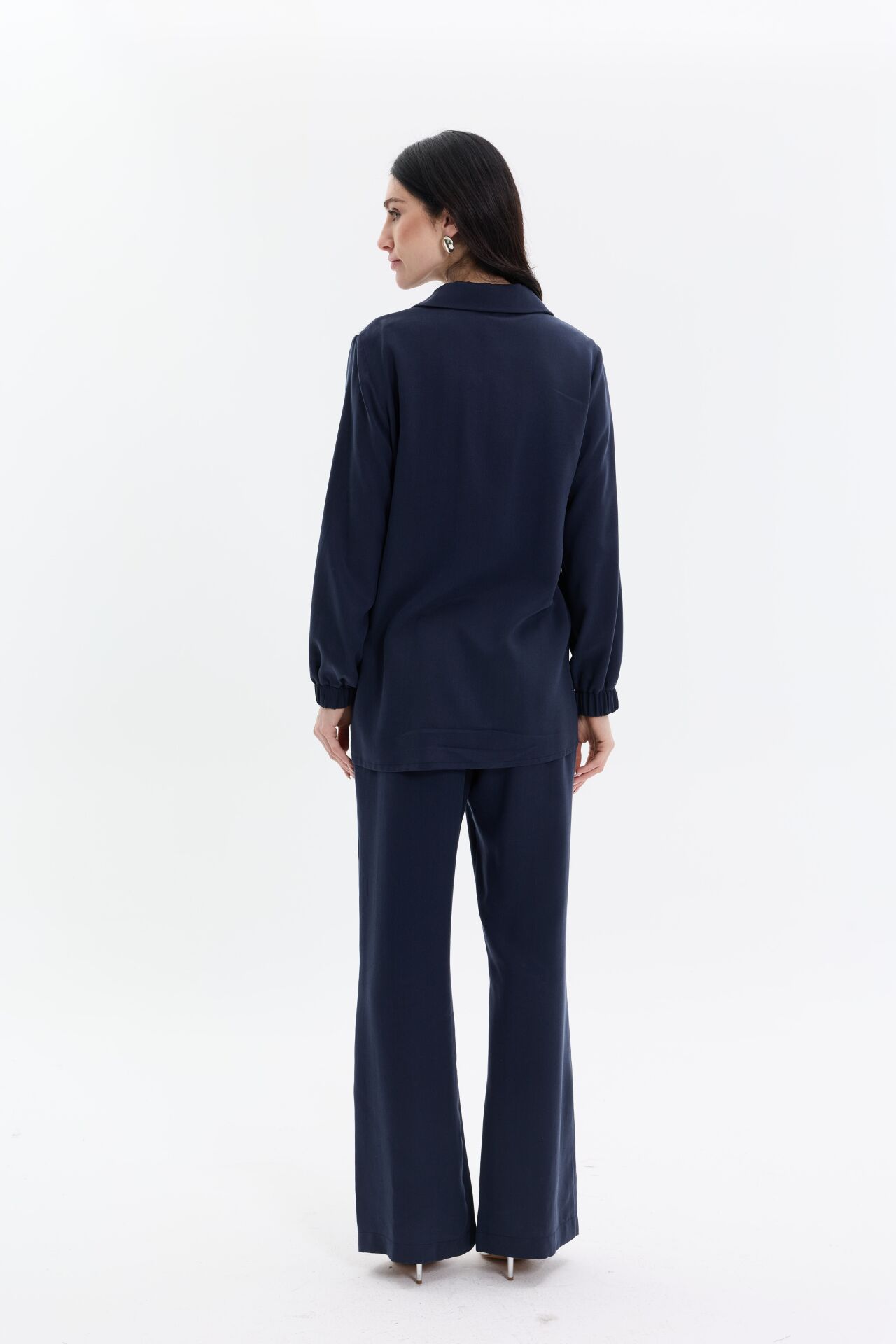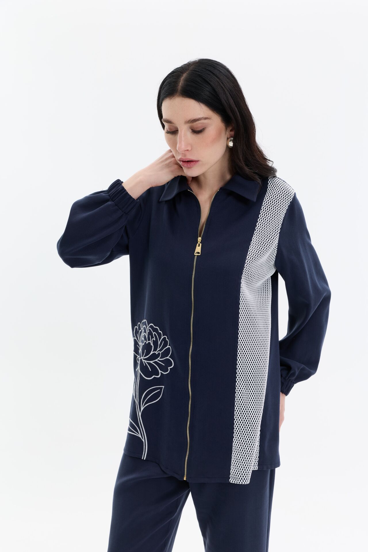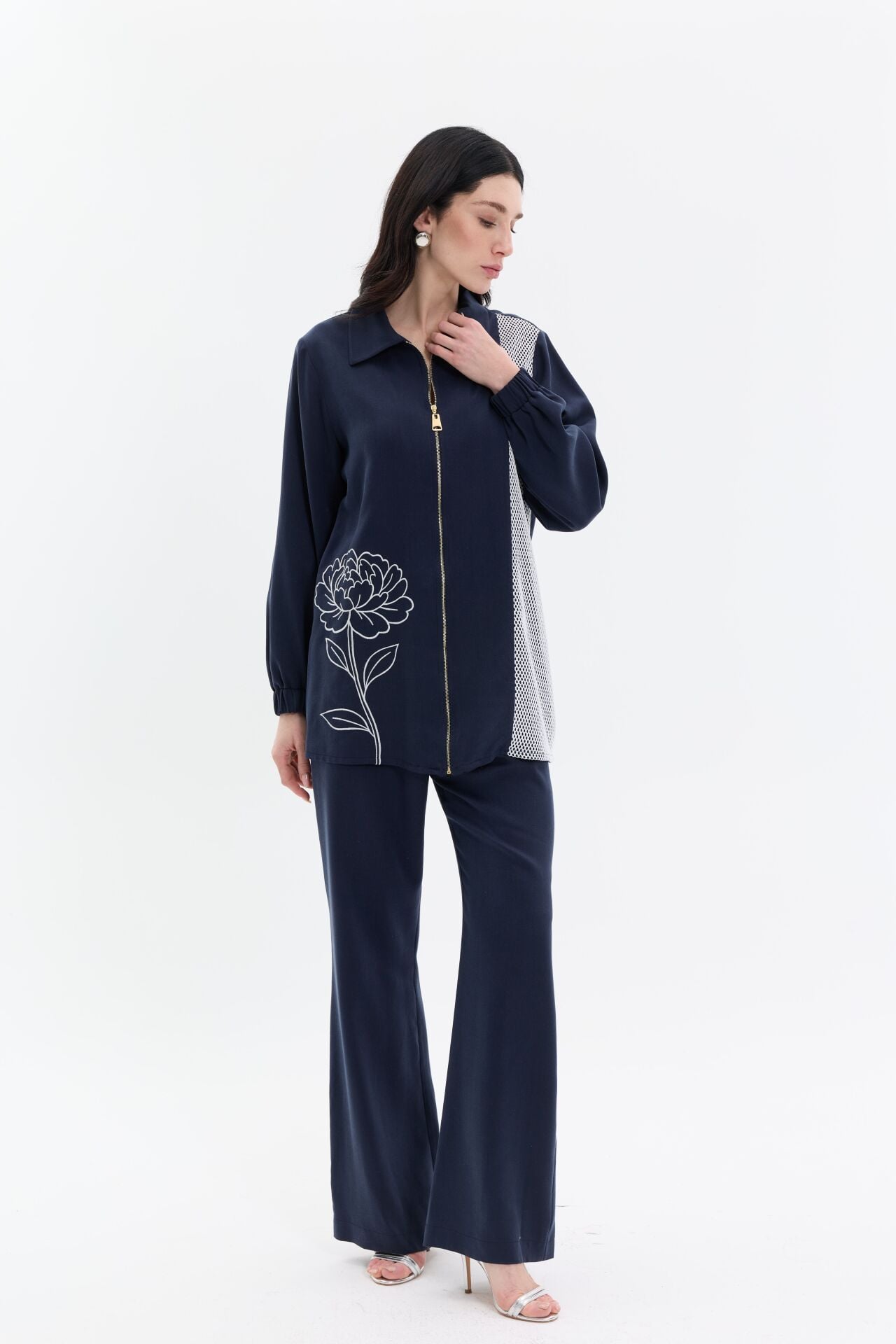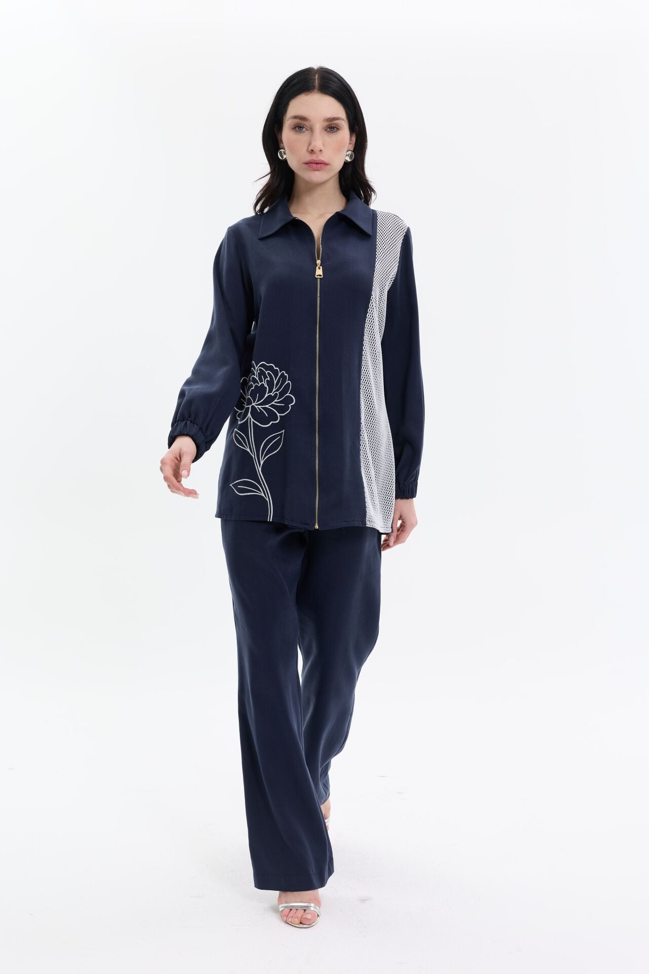 Modern çizgilerle tasarlanan iki parçalı takım, fermuar detaylı üst ve rahat kesim pantolondan oluşur. Kontrast file panel ve zarif çiçek deseni tasarıma hareket katarken, akıcı kumaşı gün boyu konfor sağlar. Günlük şıklık ve özel kombinler için zahmetsiz bir stil sunar.