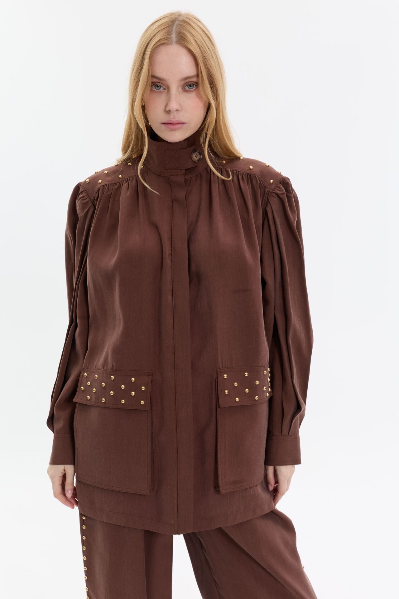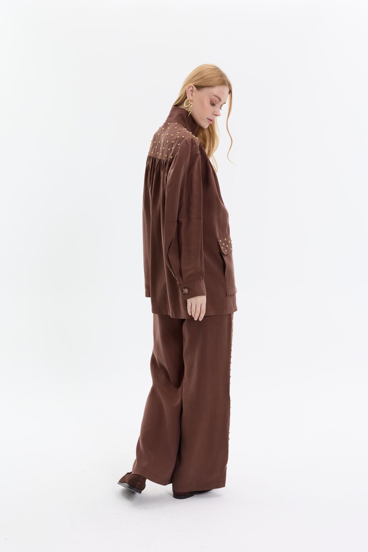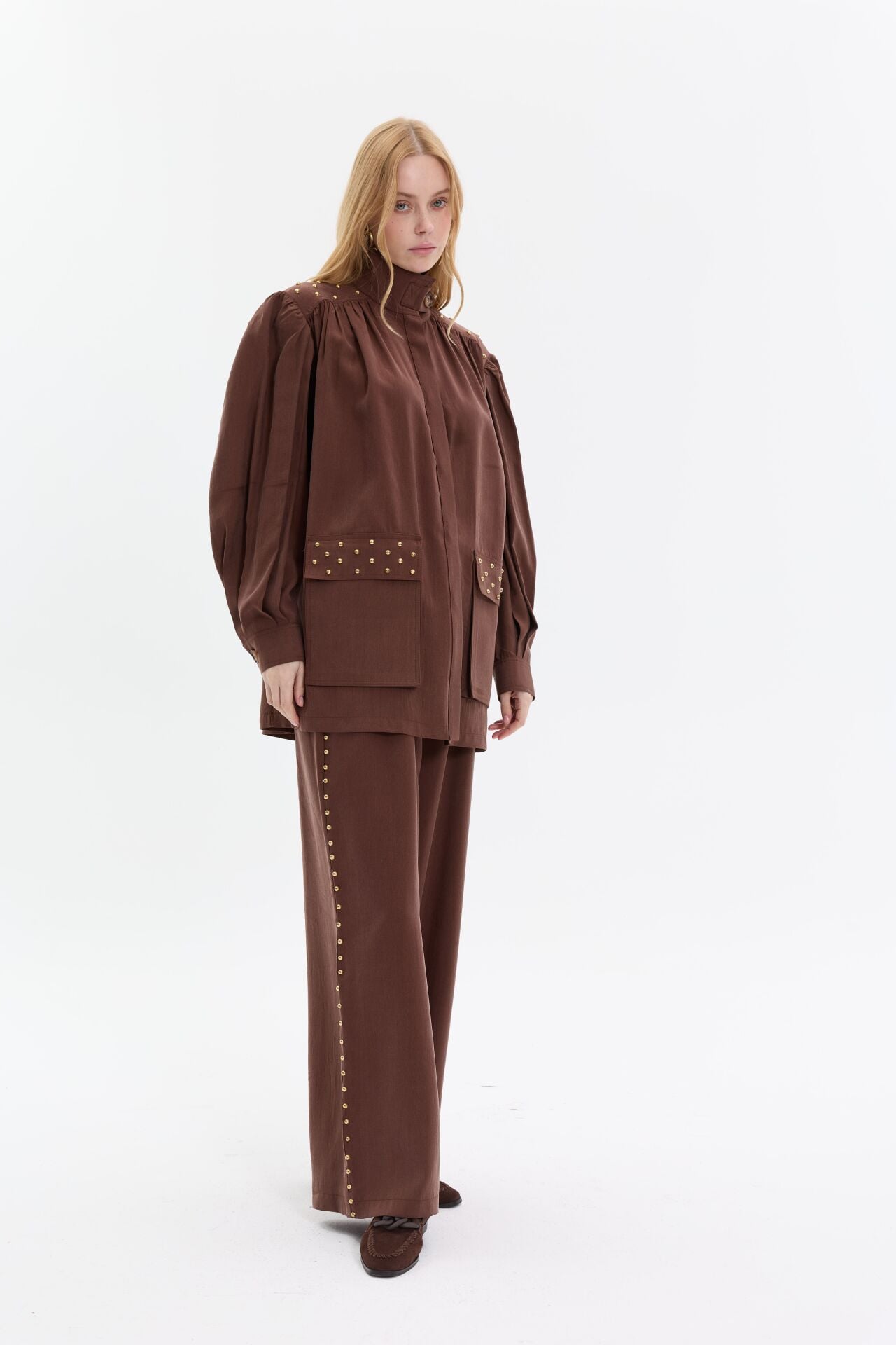 Modern ve iddialı tasarımıyla öne çıkan ikili takım, gold zımba detaylarıyla güçlü bir stil vurgusu yapar. Yüksek yaka ve rahat kesim üst formu, geniş paça pantolonla dengelenerek hem konforlu hem etkileyici bir siluet oluşturur.