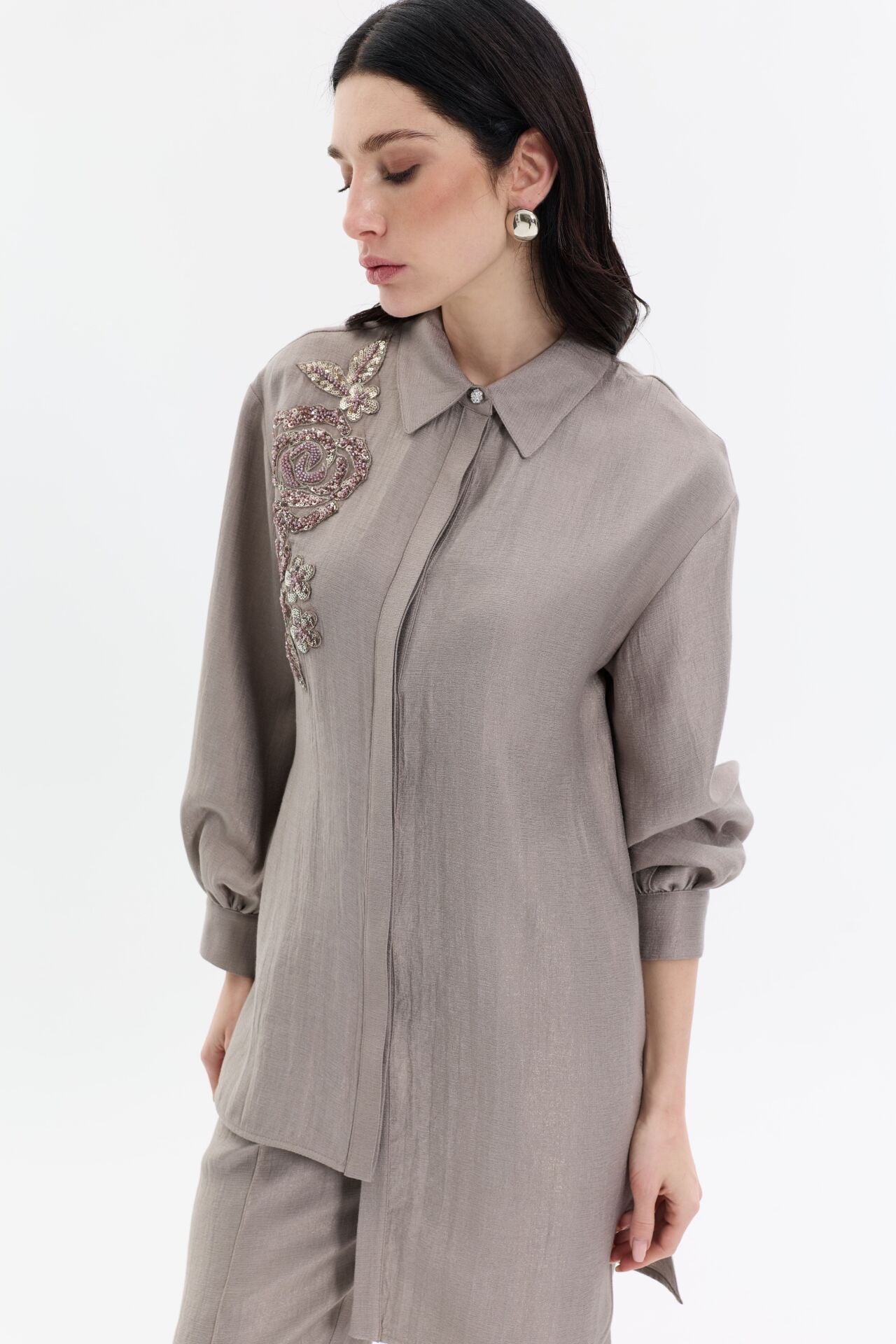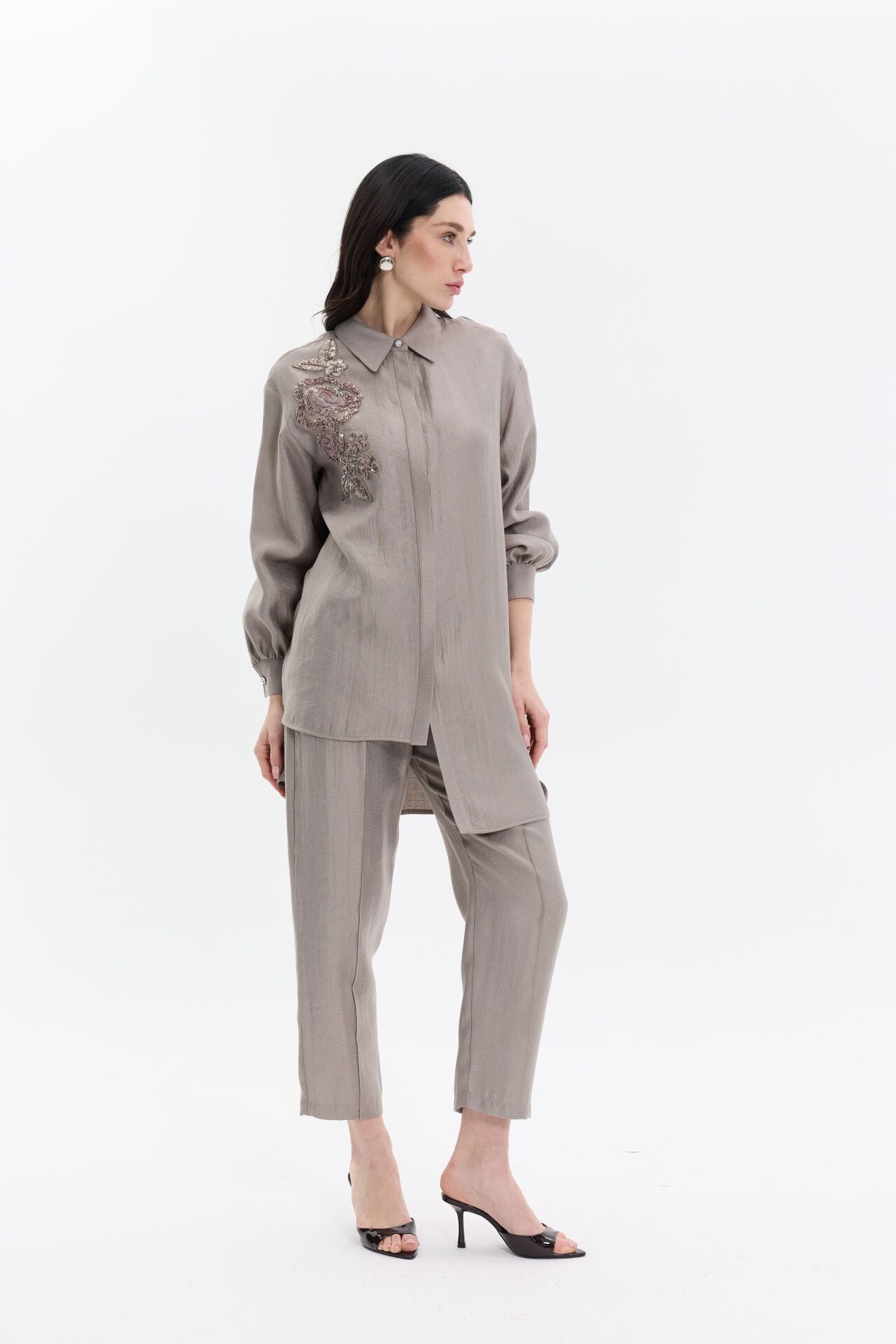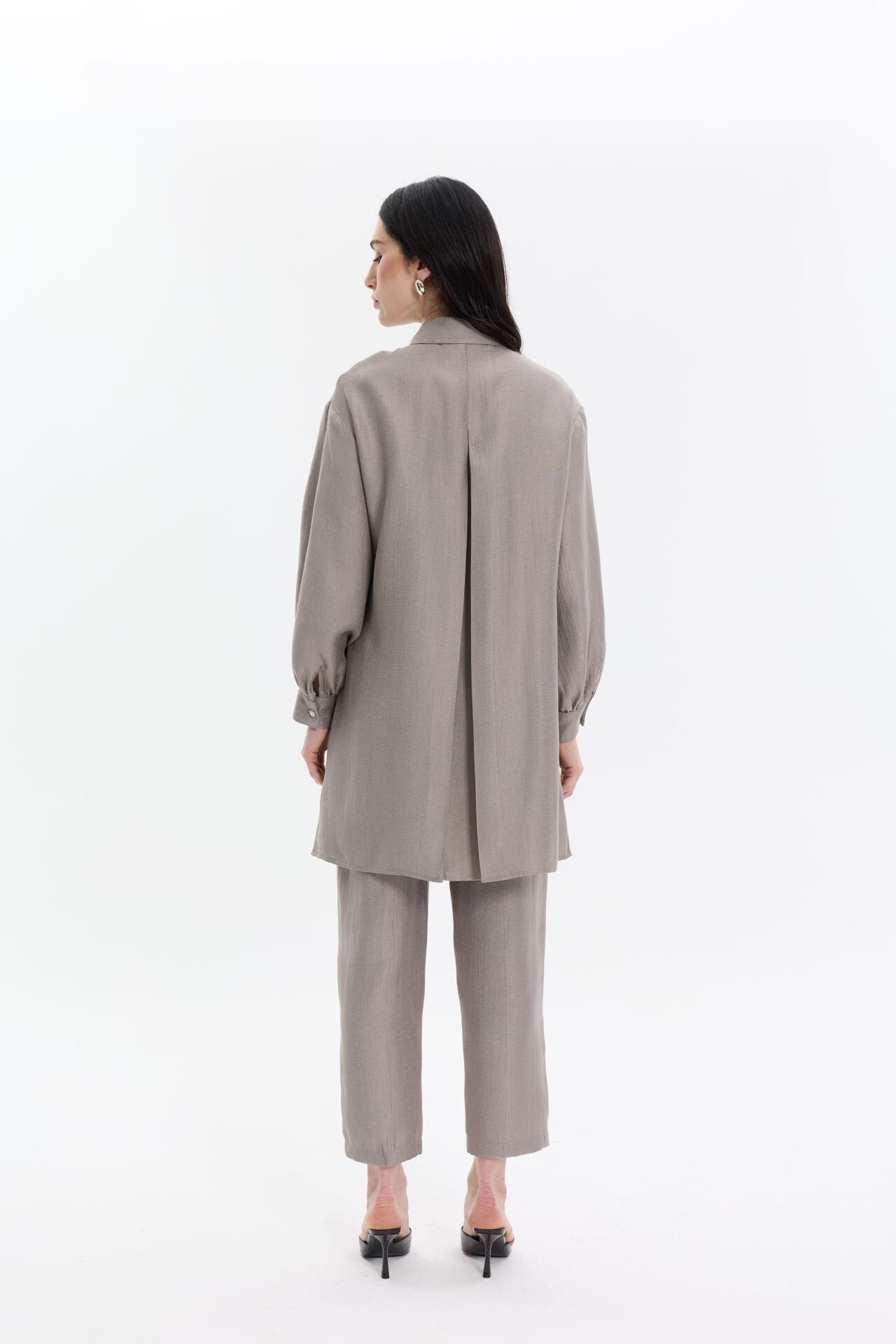 Zarif ve güçlü bir duruş sunan iki parçalı takım, viskon kumaşın akıcı ve nefes alan yapısıyla gün boyu konfor sağlar. Minimal tasarıma eşlik eden omuzdaki özel işleme detayı sofistike bir vurgu yaratır. Rahat kesim pantolon ve uzun form üst ile hem konforlu hem iddialı bir stil sunar. Günlük şıklıkta ve özel davetlerde zahmetsiz bir görünüm sağlar.