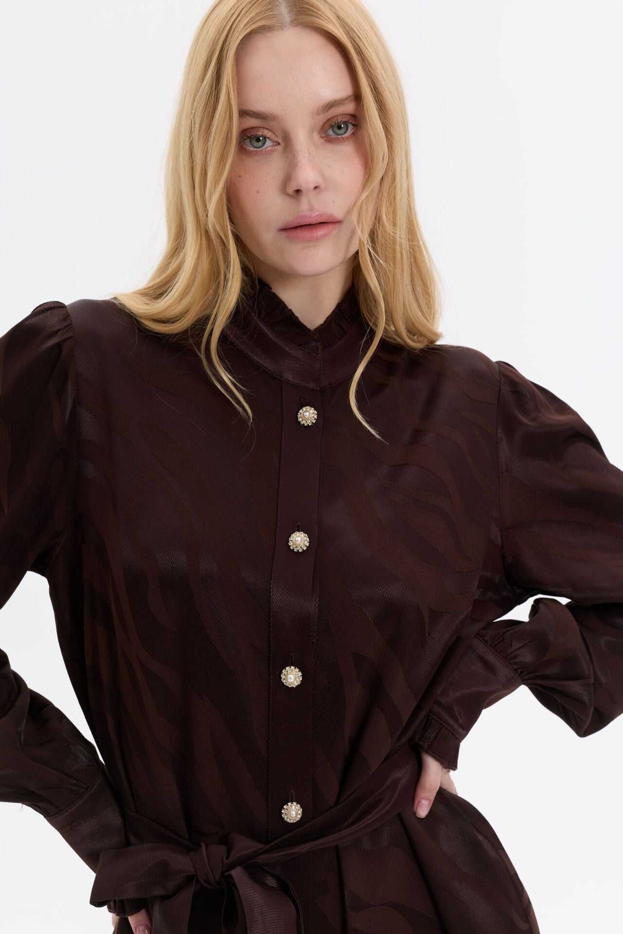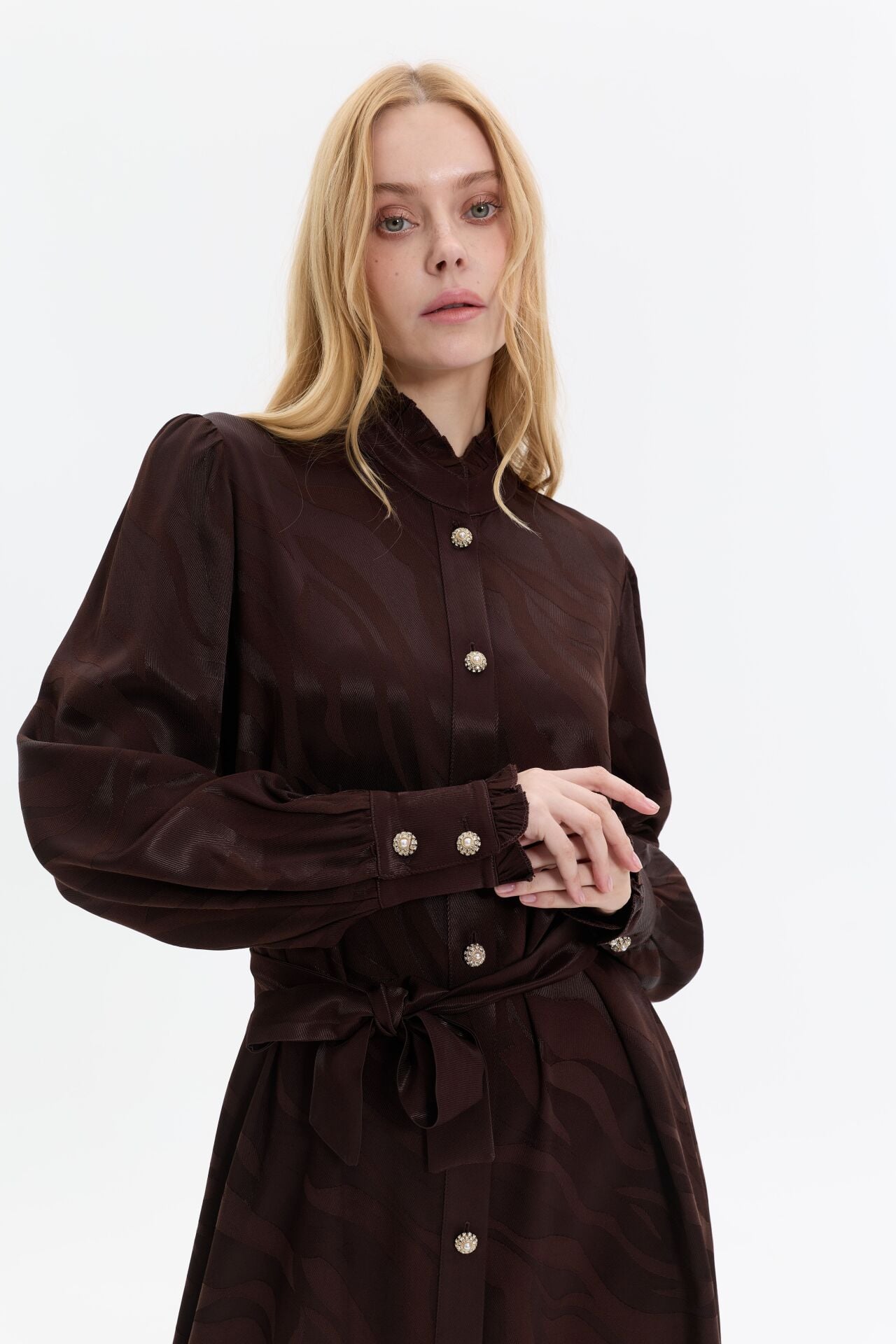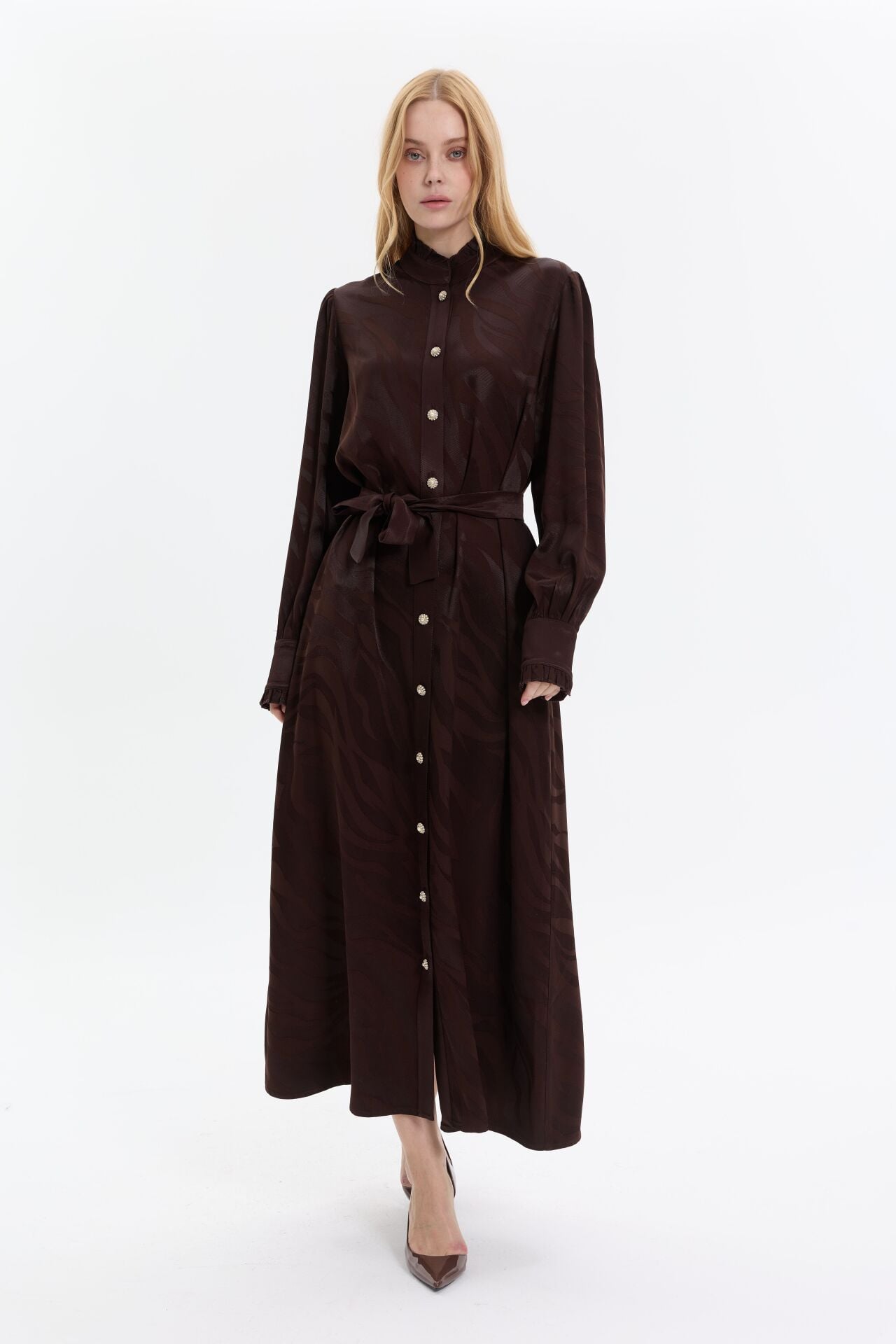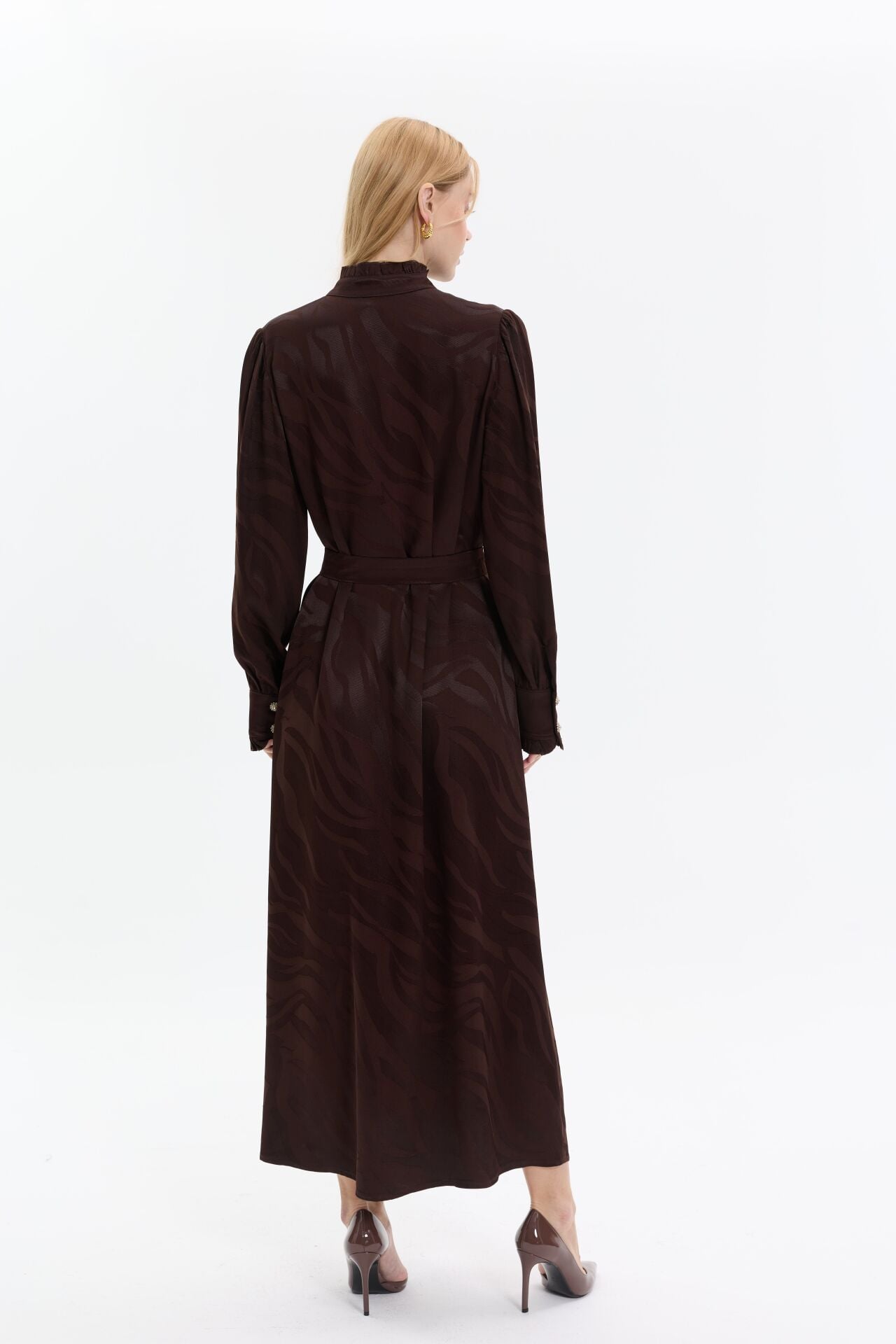 Jakar Dokulu Kemerli Maxi Elbise Kahve