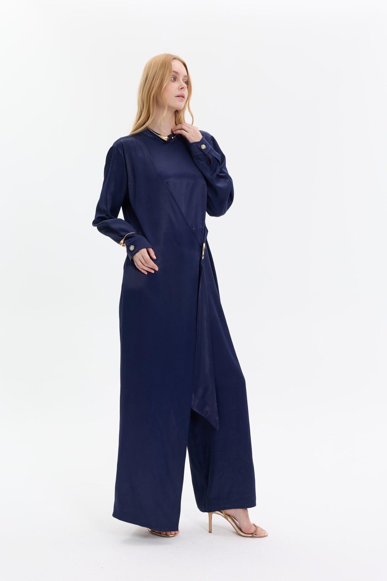 Günün her anında güçlü ve sofistike bir görünüm sunan bu lacivert tulum, minimal tasarımı ve akışkan formuyla gardırobunuzun vazgeçilmez parçası olmaya aday. Rahat kesimi sayesinde gün boyu konfor sağlarken, zarif detaylarıyla stilinizi bir üst seviyeye taşır.