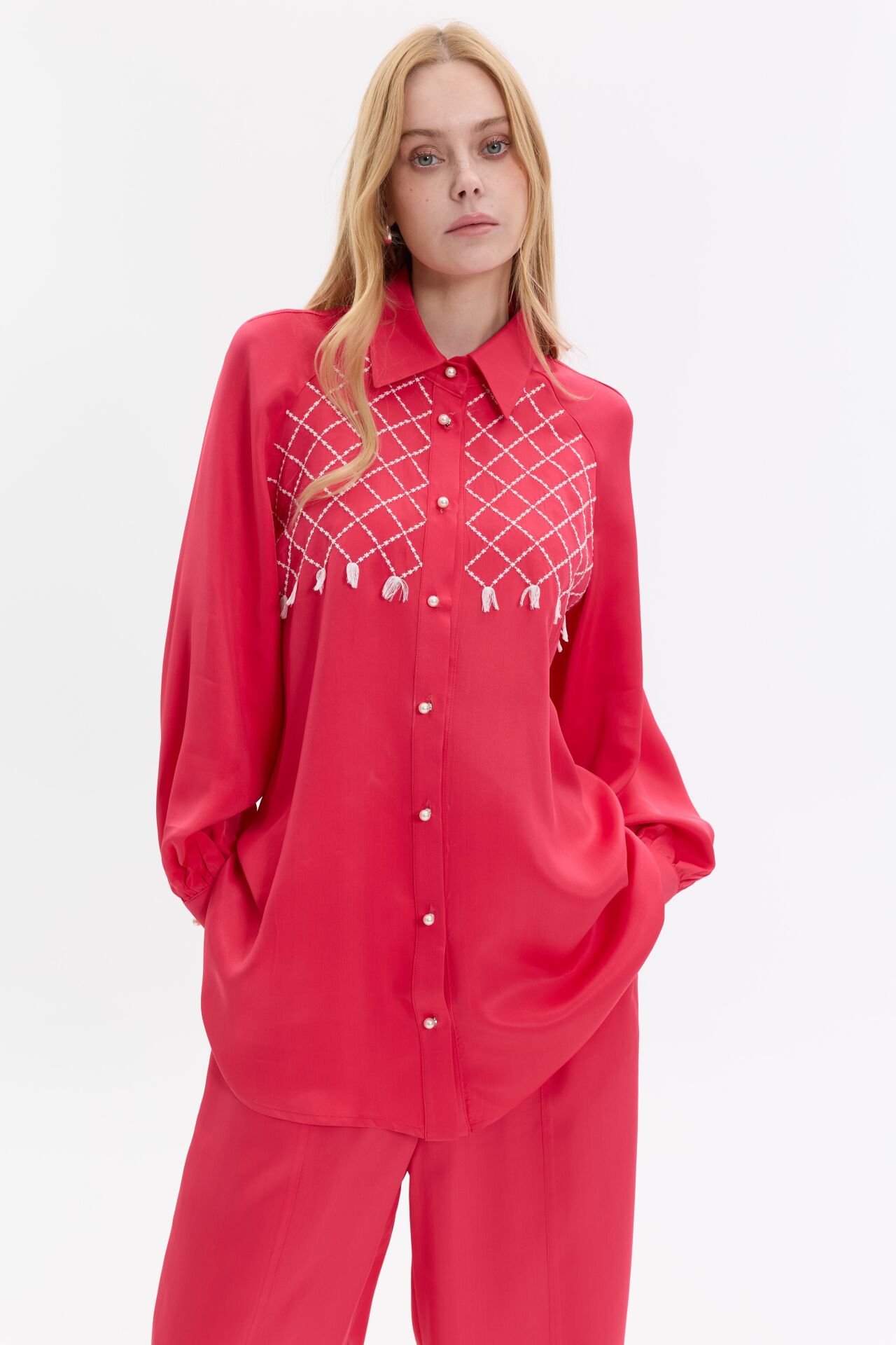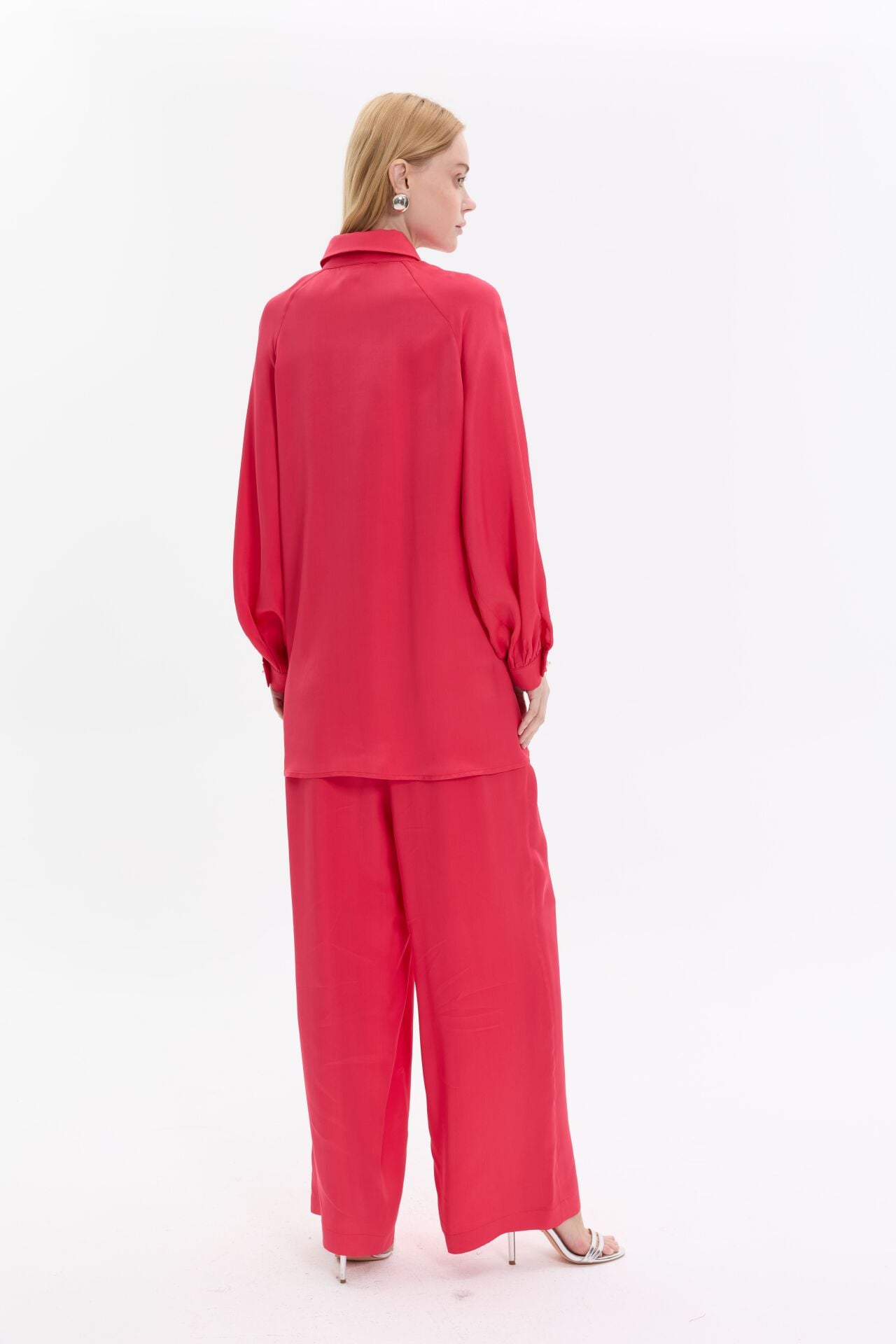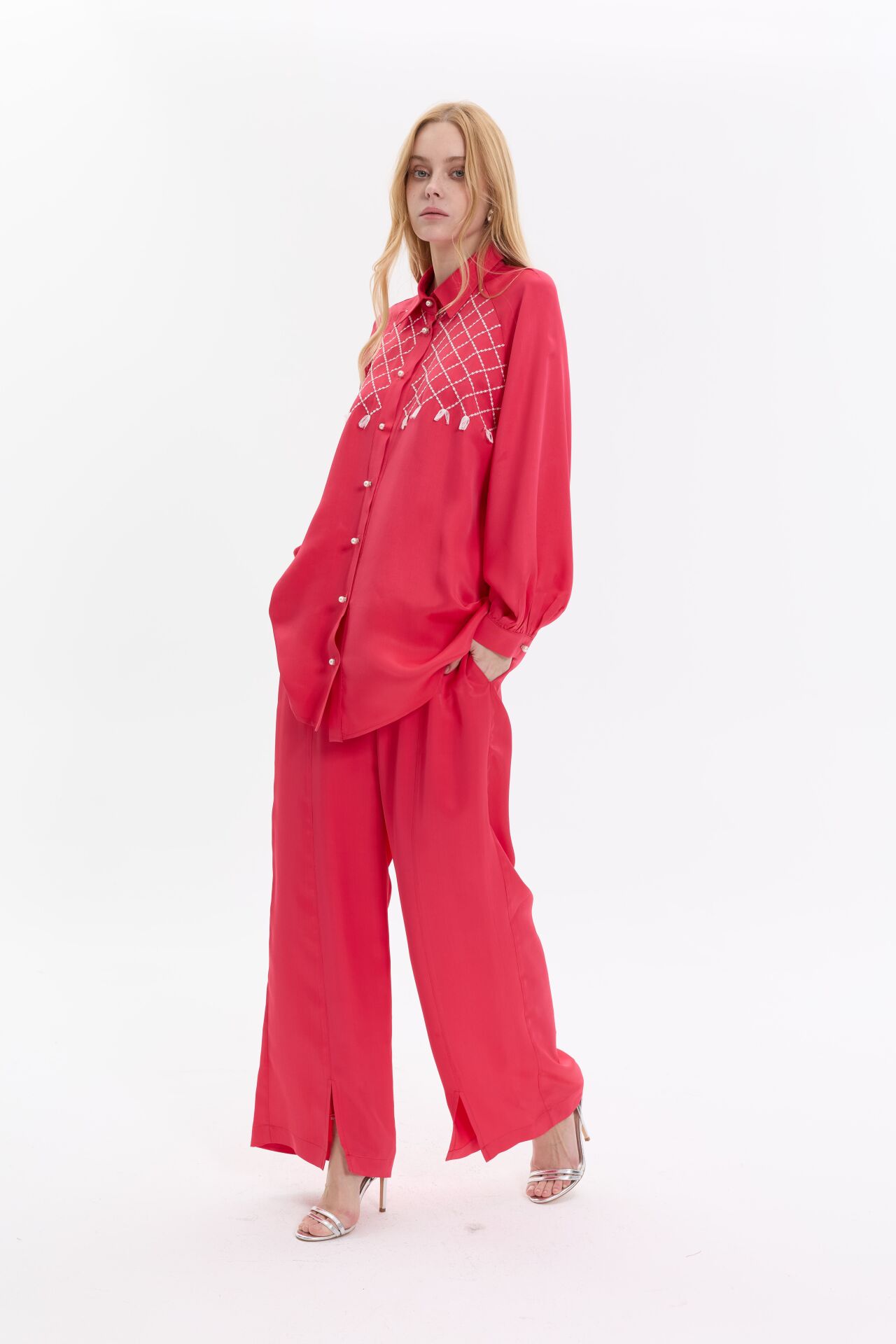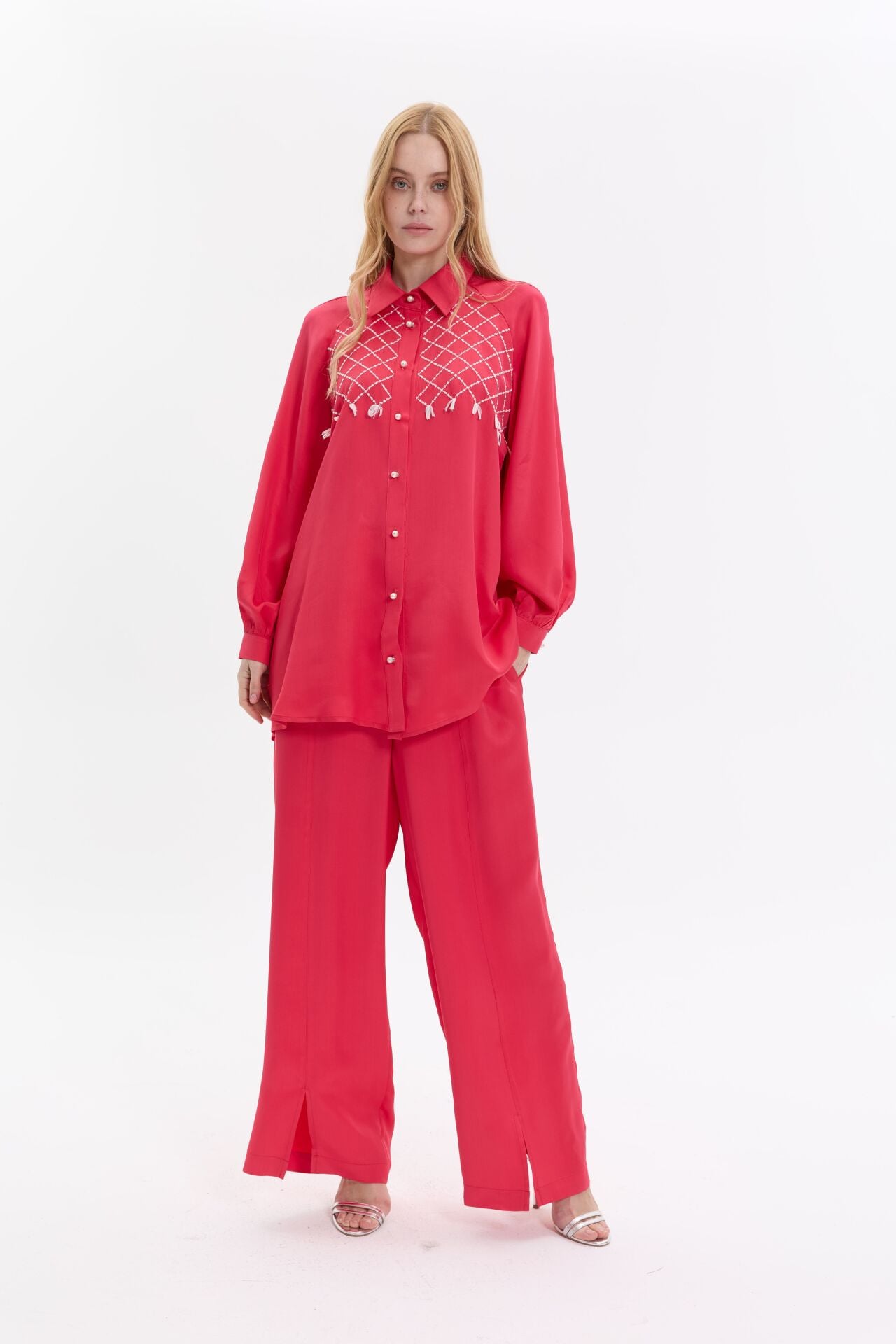 Viskon kumaşın akıcı ve nefes alan yapısıyla tasarlanan ikili takım, zarif detaylarıyla öne çıkar. Ön kısmındaki özel işleme ve düğme detaylı üst parça sofistike bir görünüm sunarken, rahat kesim pantolon gün boyu konfor sağlar. Hem günlük kombinlerde hem özel davetlerde şık ve güçlü bir stil için ideal.