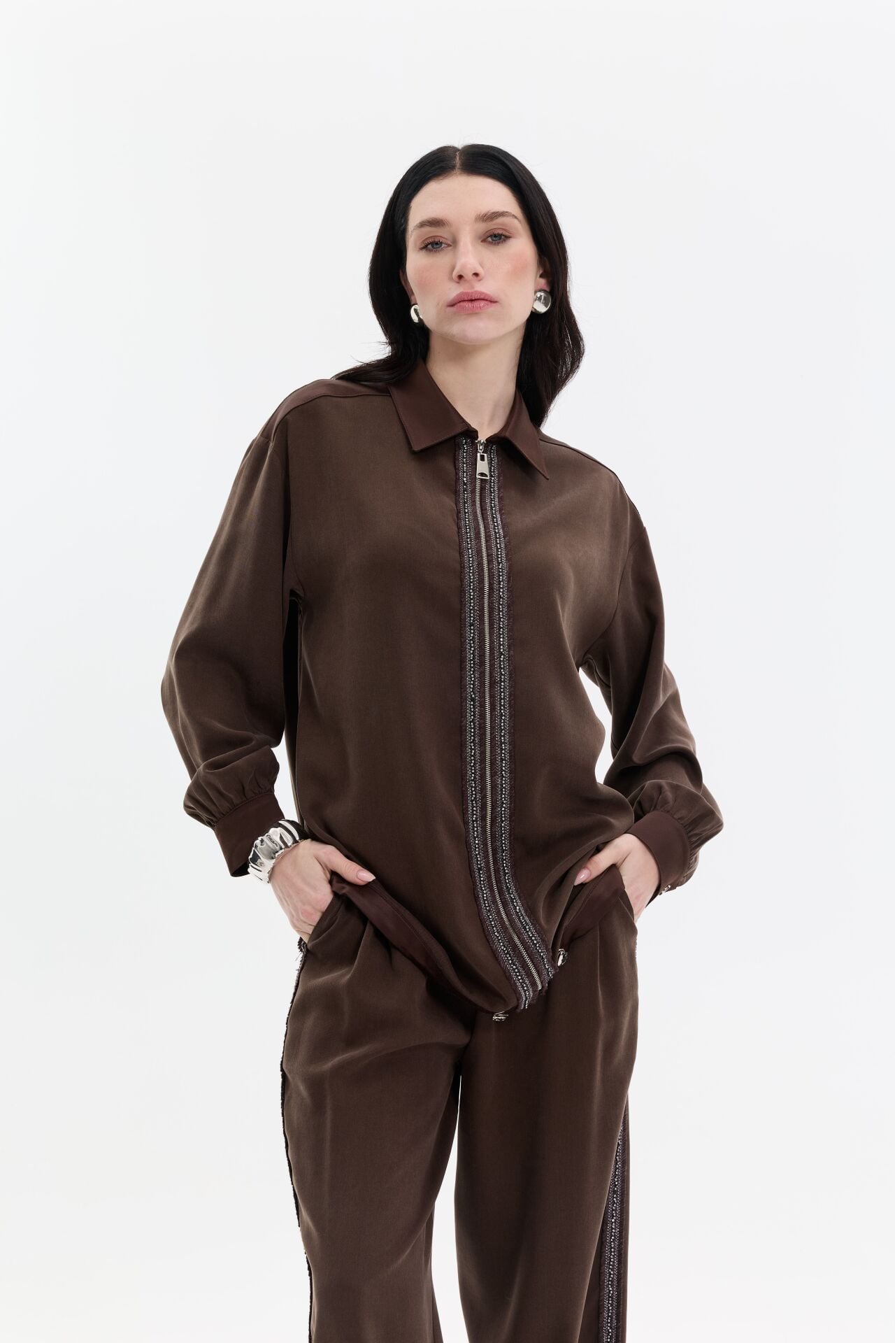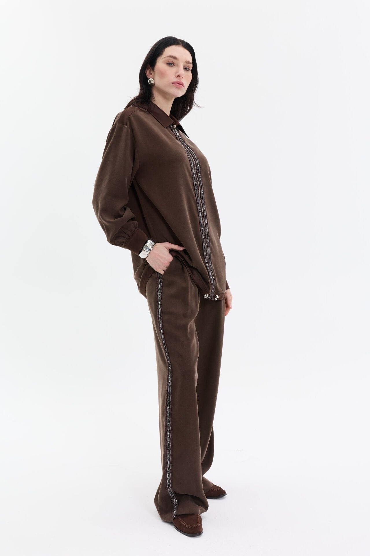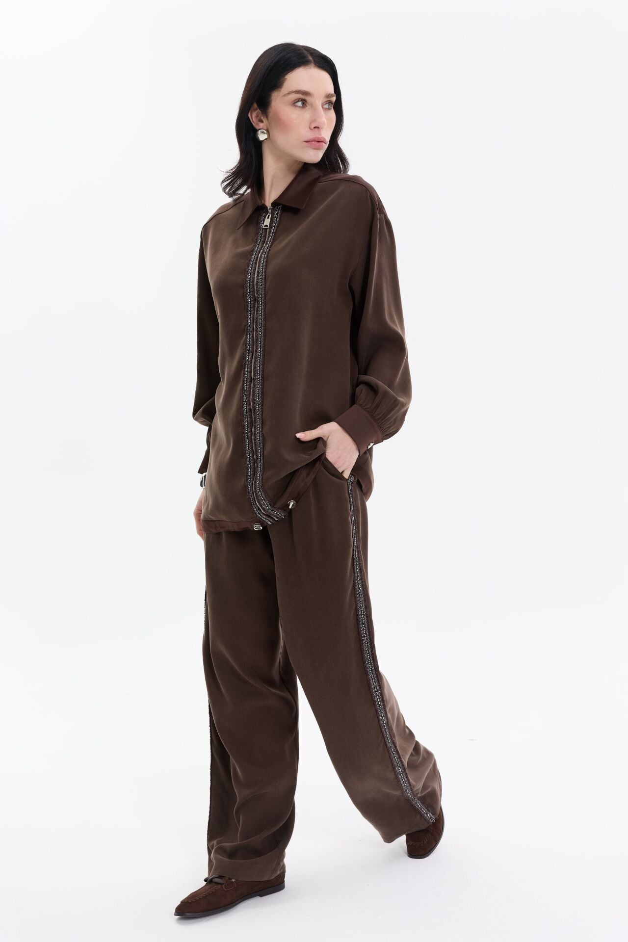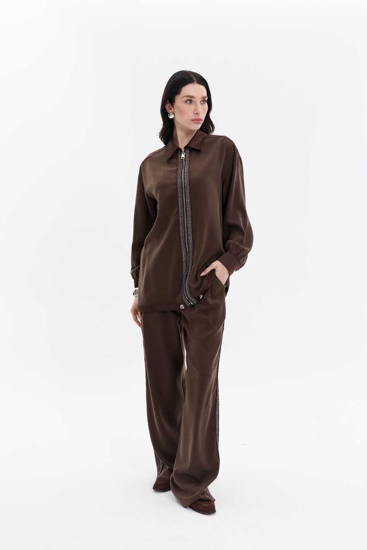 Modern kesimi ve ışıltılı şerit taş detayıyla sade şıklığı güçlü bir stile dönüştüren ikili takım. Düğmeli gömlek formu ve geniş paça pantolon tasarımıyla hem konforlu hem sofistike bir görünüm sunar.
