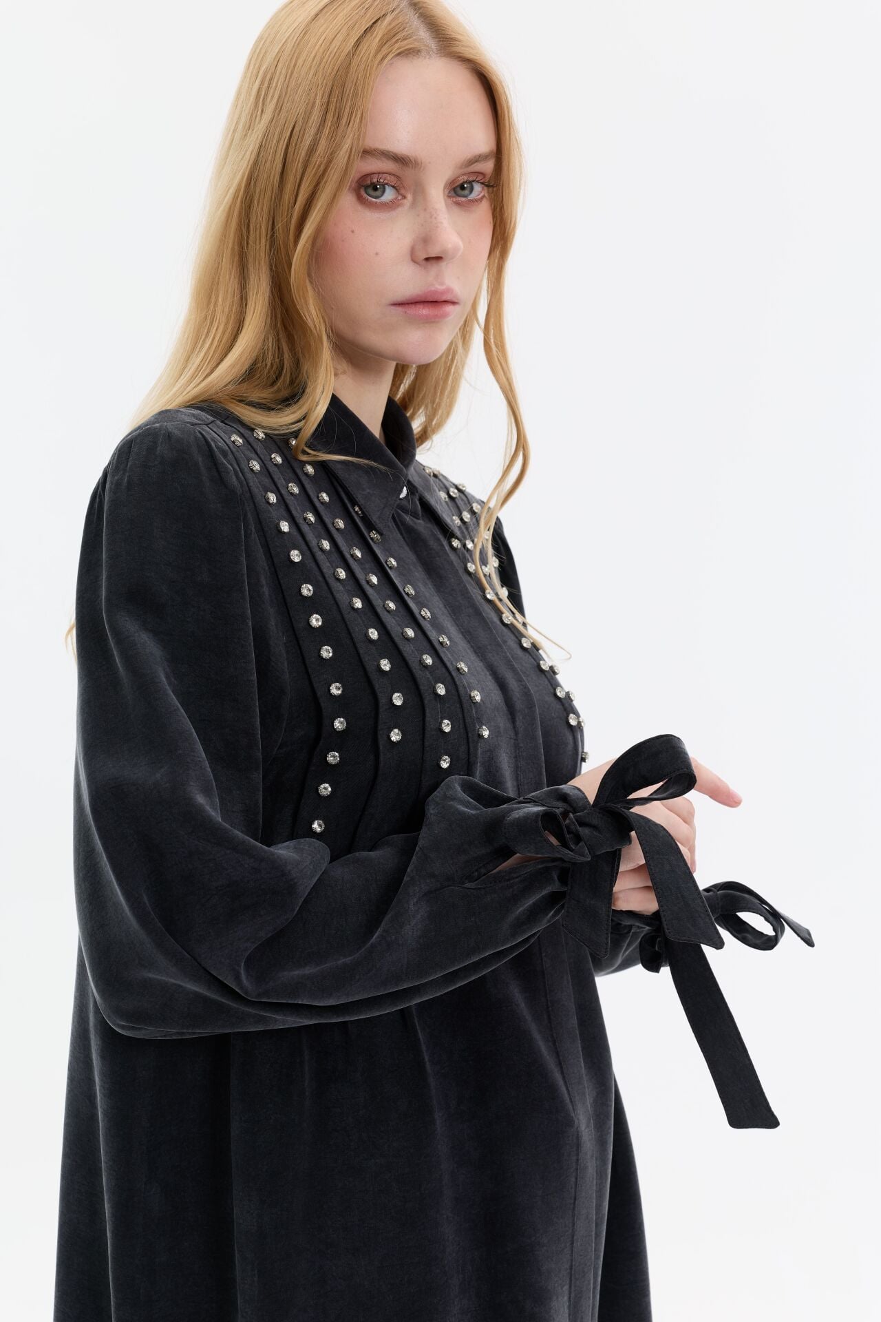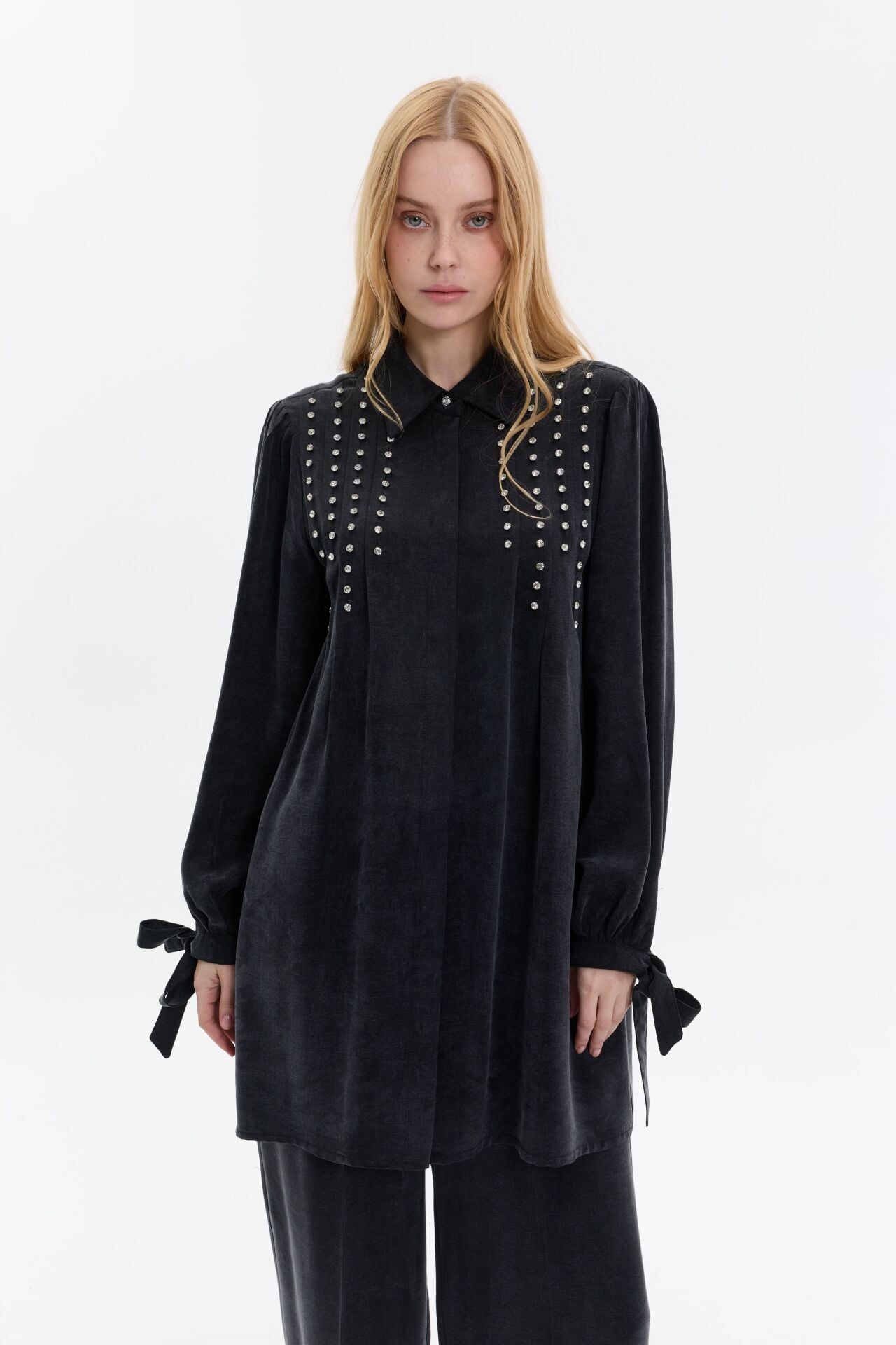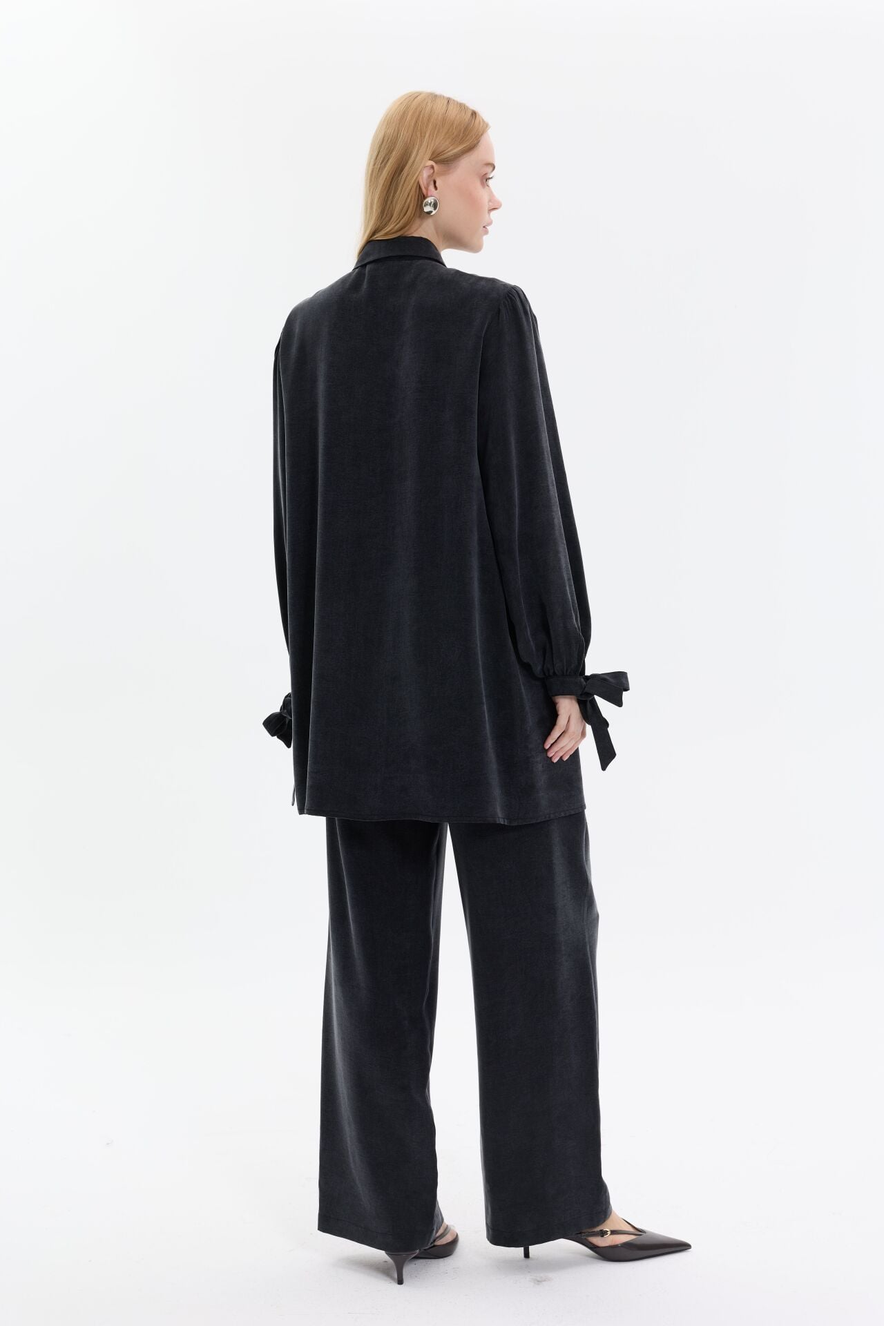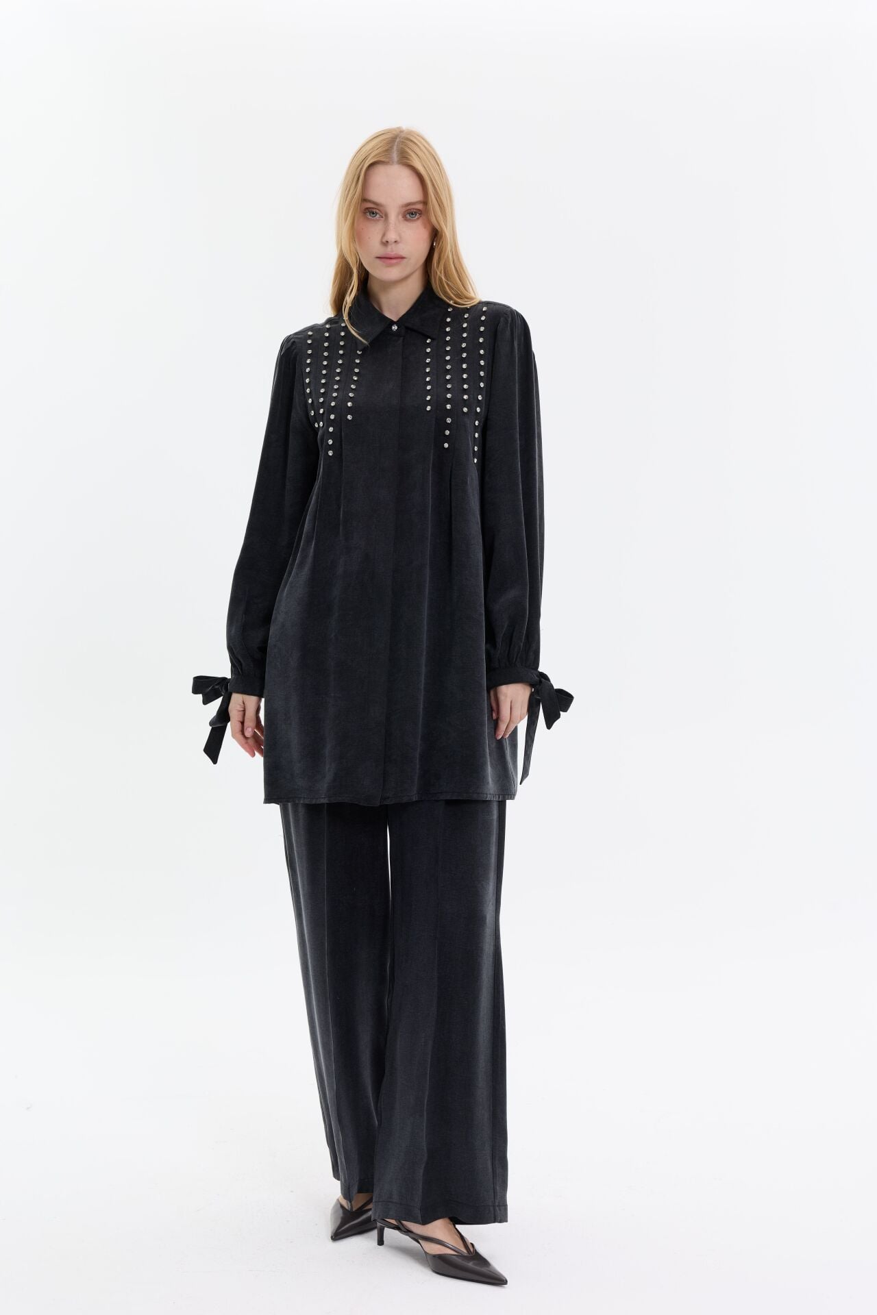 İpek kupra kumaşın hafif ve akıcı dokusuyla tasarlanan ikili takım, zarif ve güçlü bir siluet sunar. Ön kısmındaki taş detaylar modern bir ışıltı katarken, rahat kesim pantolon gün boyu konfor sağlar. Hem özel davetlerde hem şık günlük kombinlerde sofistike bir görünüm için ideal.